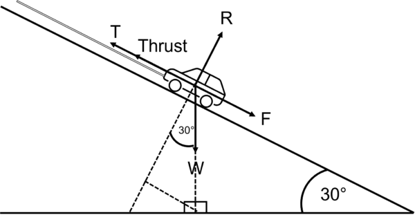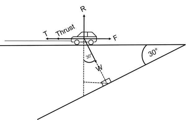 Resolving in the “new horizontal”, we have T + \text{ Thrust} = F + W\sin 30°.