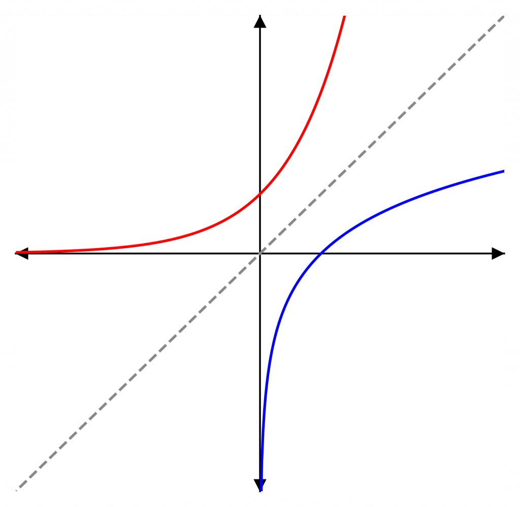The graph of the natural logarithm (in blue) is the reflection in the line y=x of the graph of the exponential function (in red).