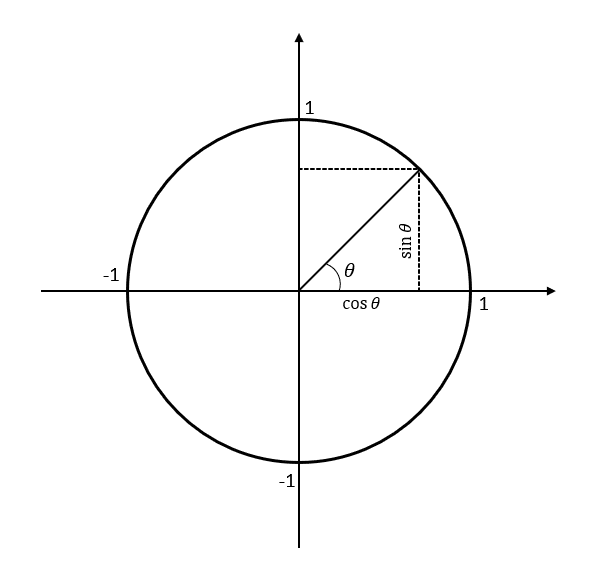 The Unit Circle is a circle of radius 1, which is centred on the origin. Any point on the unit circle has co-ordinates (\cos \theta , \sin \theta ), where \theta is the angle between the positive x axis and the line connecting our point and the origin, in an anticlockwise direction. That can be extended all the way to \theta = 360°, at which point, the circle is repeated.