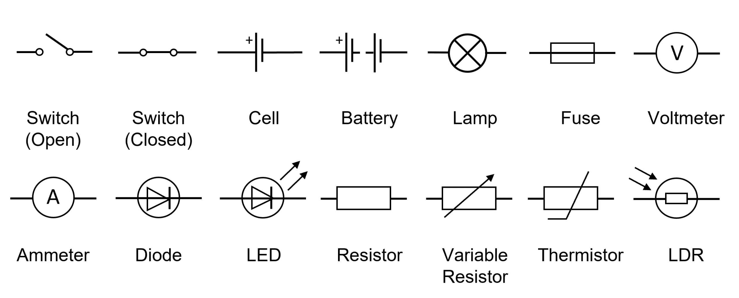 Circuits can be drawn using symbols to give a visual representation of what the desired circuit should include. Symbols allow scientists to visualise a circuit without a language barrier as symbols are universal. Here is some of the circuit symbols you will come across in this unit: