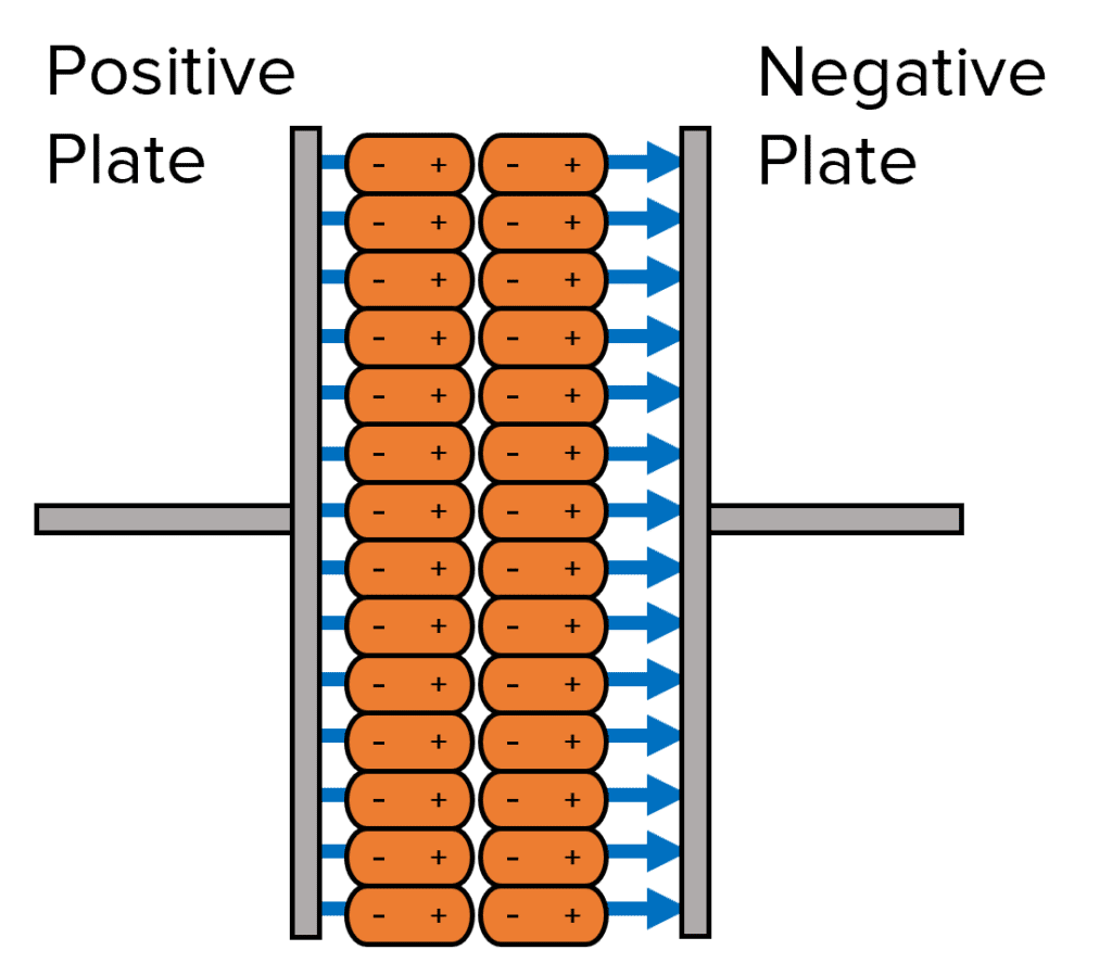 However, when a charge is put across the parallel plates, each plate takes on an opposite charge and all the dielectric molecules align accordingly. This is because the positive pole is attracted to negative plate and the negative pole is attracted to the positive plate.
