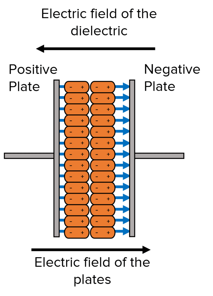 When a charge is passed through to the plates of the capacitor, an electric field is produced between the plates. At the same time, the dielectric molecules align themselves and create their own electric field. From the diagram below, we can see that when this occurs, the electric fields oppose each other.
