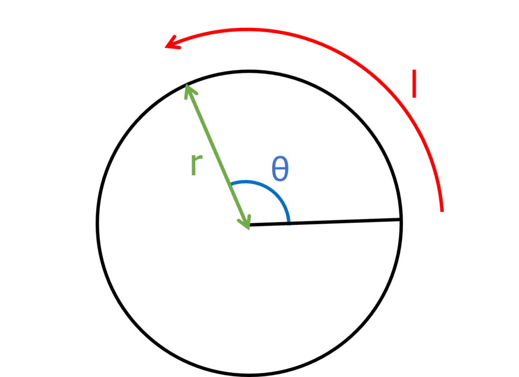 - l= arc length (distance travelled around the circle) in metres \text{(m)}