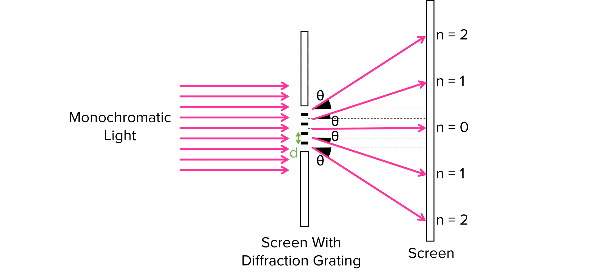 A diffraction grating also can be used to produce a diffraction pattern on a screen, as seen with the single slit. Areas of maxima (constructive interference) and minima (destructive interference) can be seen on a screen away from a central maxima.