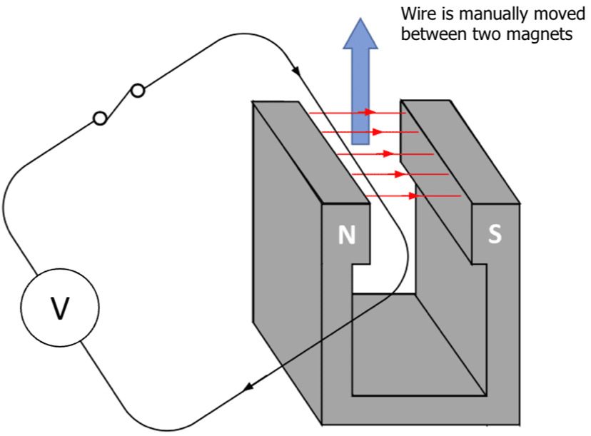 When the wire is moved between the magnets, through the magnetic field, a reading can be seen on the voltmeter. This is because the wire cuts the magnetic field lines and causes a change in magnetic flux. Therefore an EMF is induced.