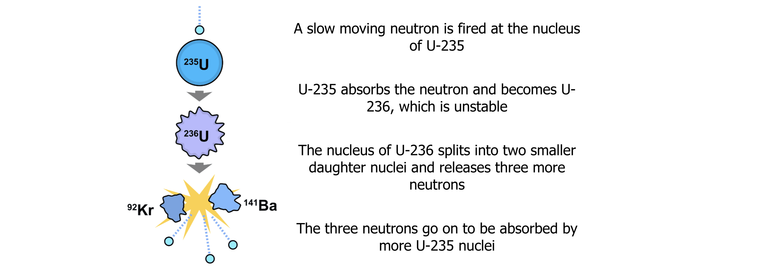 Nuclear fission involves the splitting of a larger nucleus into multiple smaller nuclei. The process produces several products but also huge amounts of energy. The process of a fission reaction can be seen below: