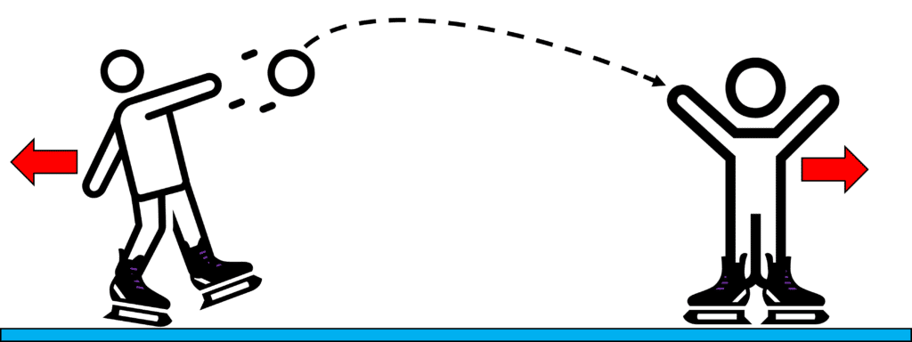 When the other person catches the ball, they will also move backwards, again to conserve momentum.