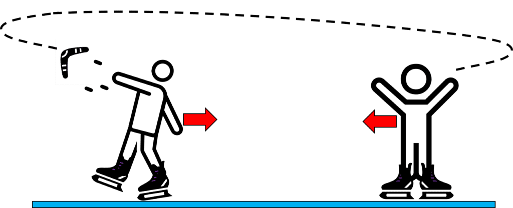 When the other person catches the boomerang, they will also move backwards towards the original thrower. This occurs due to conservation of momentum. This interaction between the people continues therefore they ‘attract’ each other.