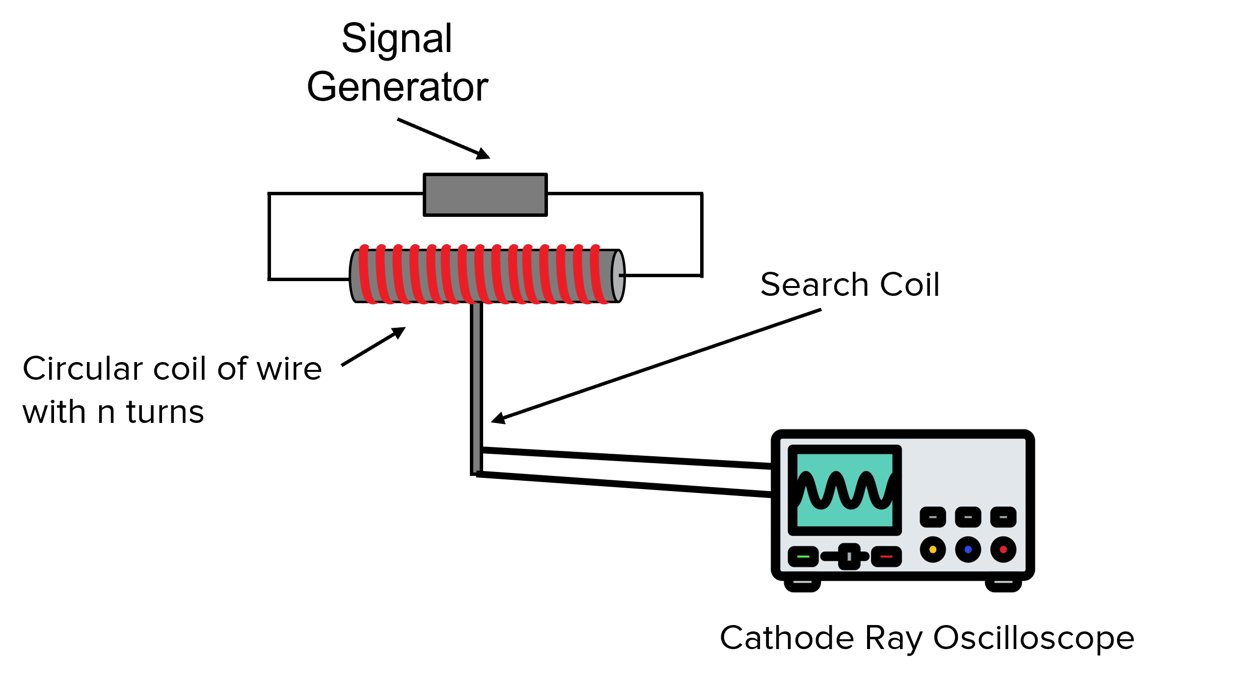 The circular coil of wire creates a uniform magnetic field of which the search coil is rotated within. The oscilloscope will display the varying EMF produced as the search coil rotates within the coil of wire.