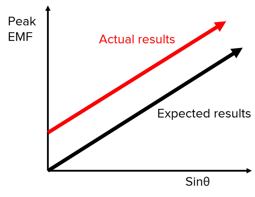 It is likely that the y-intercept of our experimental results will not be zero when the search coil and coil of wire are parallel. This is because of a degree of human error when trying to make sure the wires and search coil are parallel.