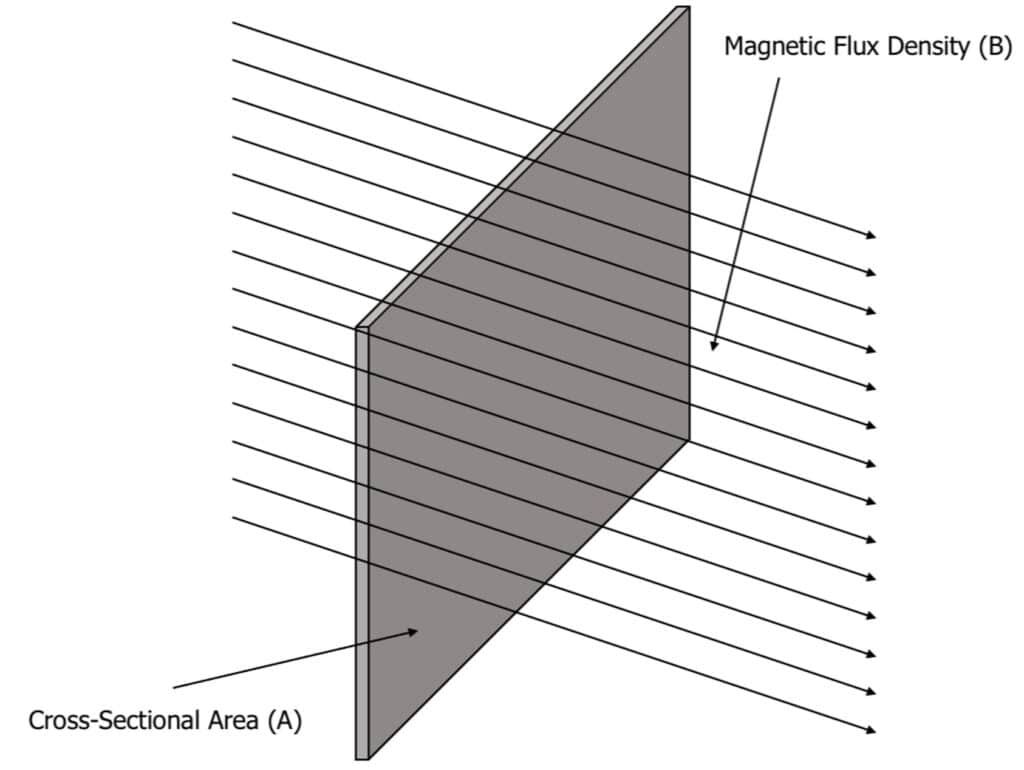 Example: A wire of cross sectional 0.001 \text{m}^2 cuts through a magnetic field with density 2 \times 10^{-3} \: \text{T}. Calculate the magnetic flux density and give the appropriate units.