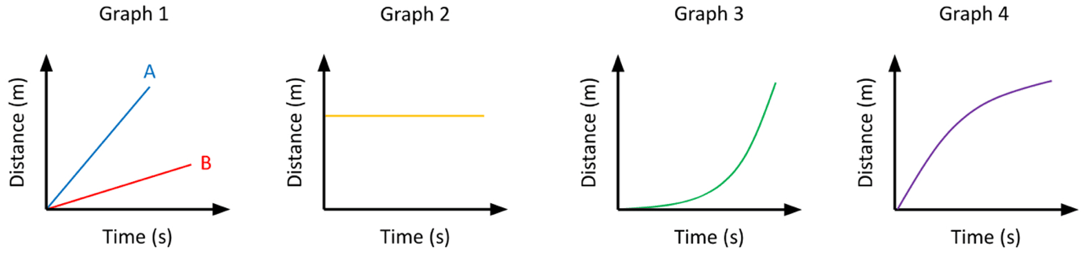 A journey of an object can be represented in a graph. The two types of graph you need to be able to interpret are distance-time graphs and velocity-time graphs.