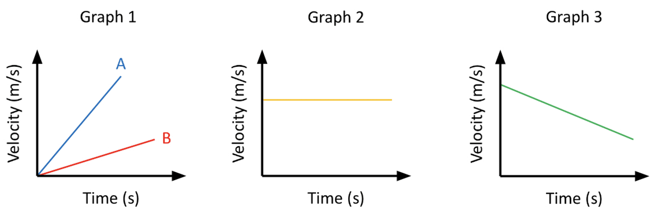 - In Graph 1, velocity is increasing over time. This shows a constant rate of acceleration. The greater the gradient, the greater the acceleration. So line A shows a greater positive acceleration than line B.