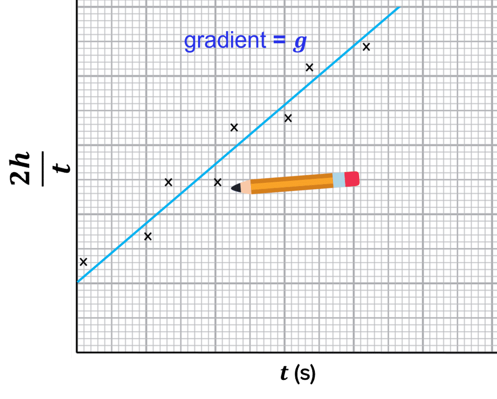 Therefore, to find \textcolor{2730e9}{g} we can plot a graph of \textcolor{7cb447}{\dfrac{2h}{t}} against \textcolor{d11149}{t}. The gradient of this graph will be equal to our value of \textcolor{2730e9}{g}.