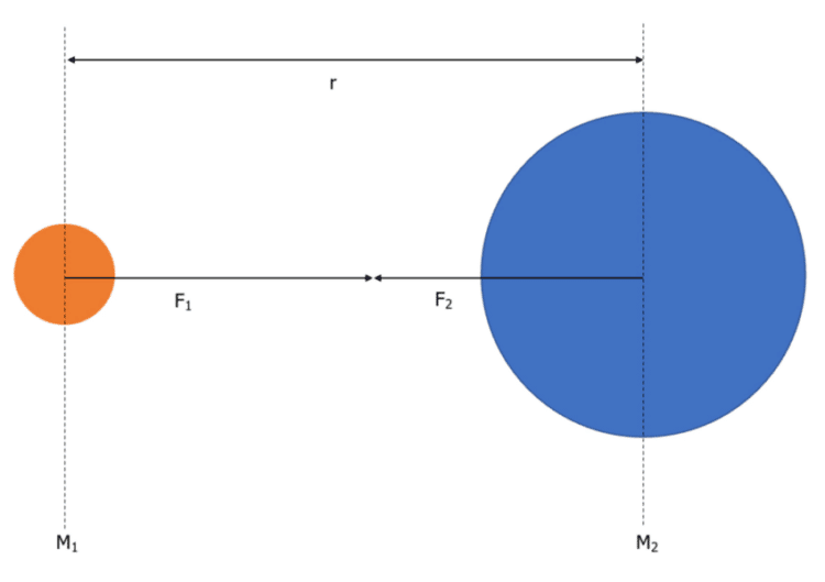 Newton’s law of gravitation states that any object with a mass will attract another object with a mass proportionally to the product of their mass and inversely proportionally to their separation squared. Therefore: