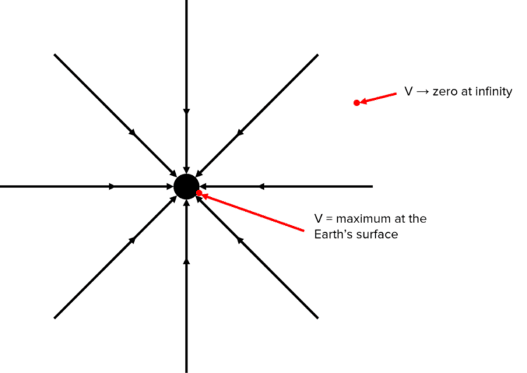 The gravitational potential \left(V\right) is another term commonly used and can be defined as the work done per unit mass when moving a mass at rest from infinity to a given point. In this definition, infinity is a point outside the gravitational field.