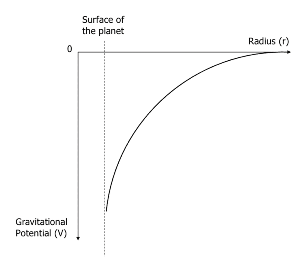 The graph represents the relationship between gravitational potential \left(V\right) and distance from the centre of the planet \left(r\right).