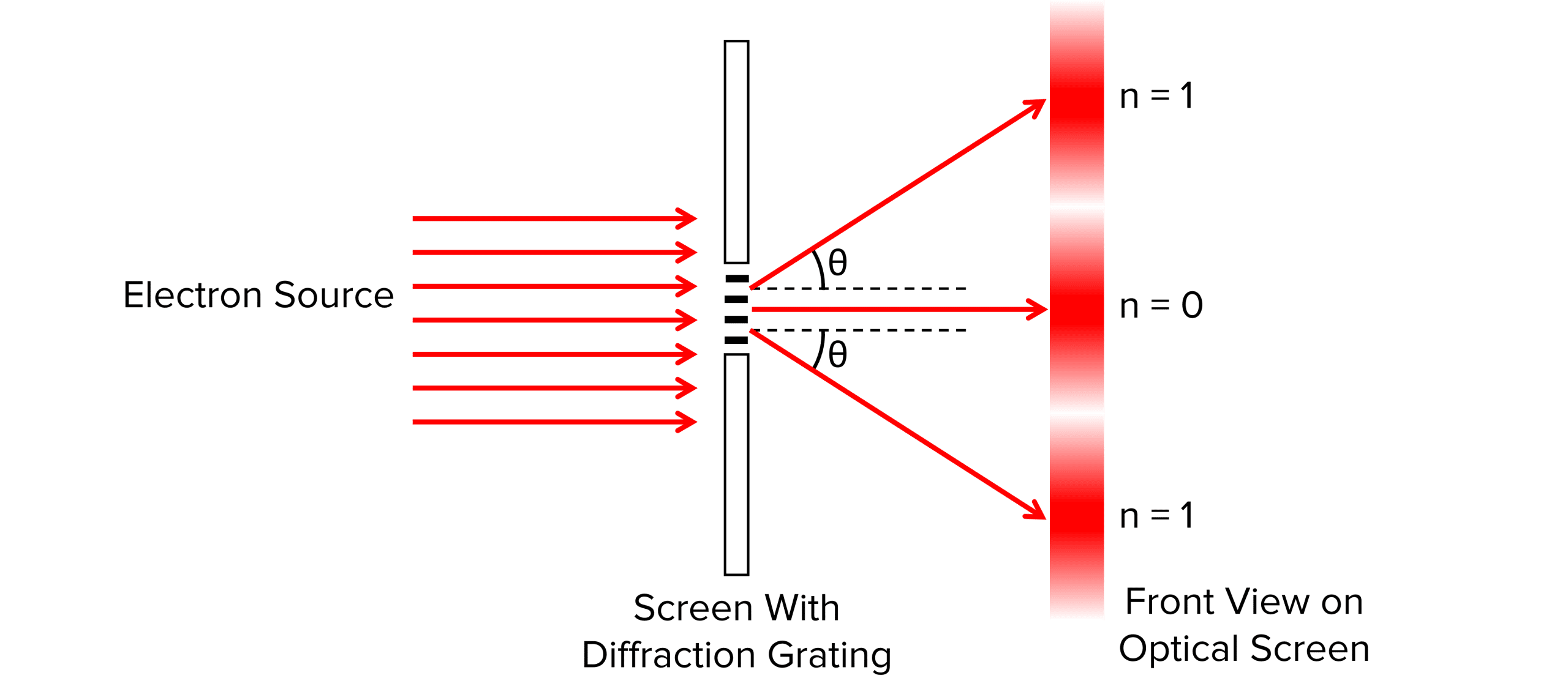 If the electron is passed through the diffraction grating it forms a pattern of concentric rings made of minima and maxima on a screen. By measuring the angle to the first minima, the radius of a nucleus can be calculated using: