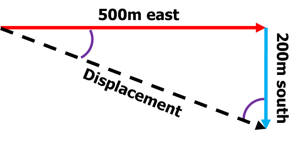 Example: A jogger runs 500\: \text{m} east, then 200 \: \text{m} south. What is their displacement?