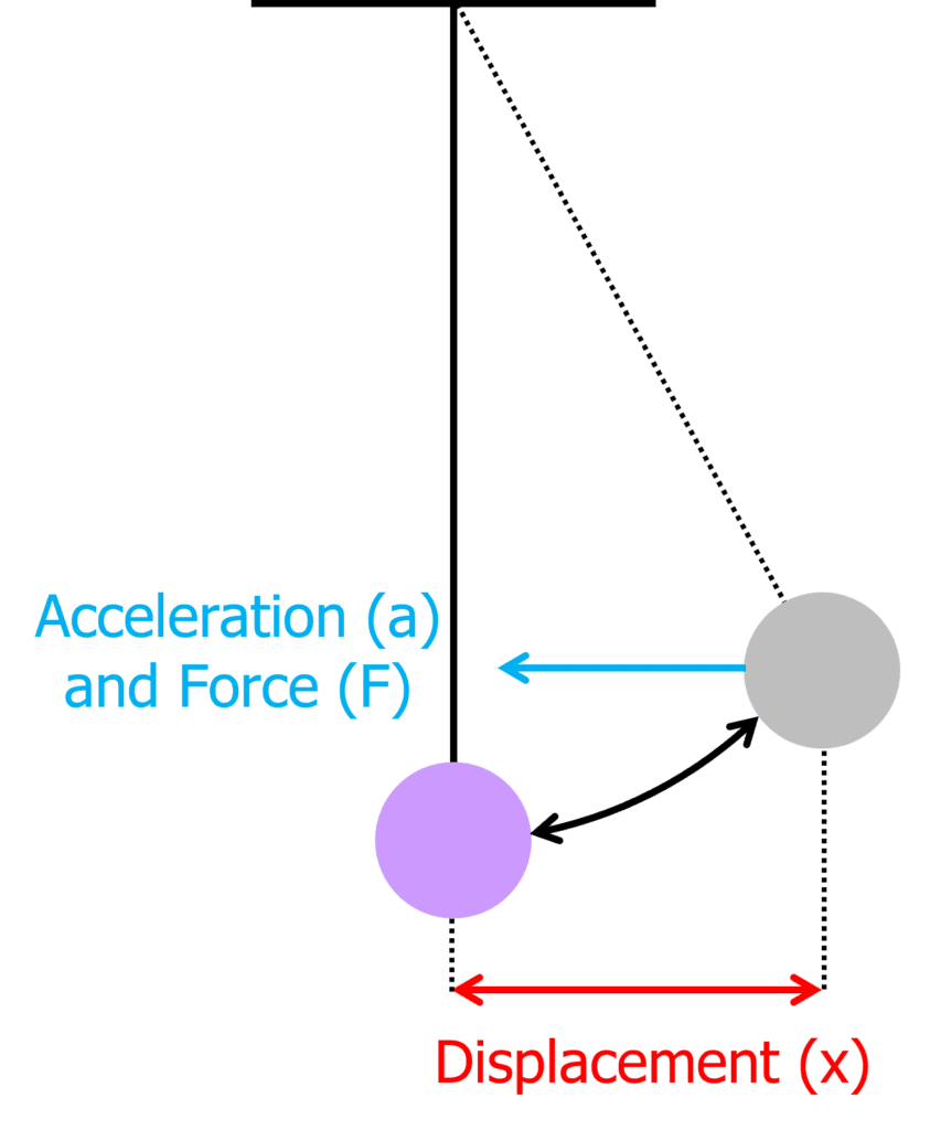 A mass and a string can form a pendulum system which moves in simple harmonic motion (SHM). If a mass is pulled to maximum displacement on a string, a restoring force will return the mass to the equilibrium position. The restoring force is the force responsible for bringing the oscillating object back to the equilibrium position.