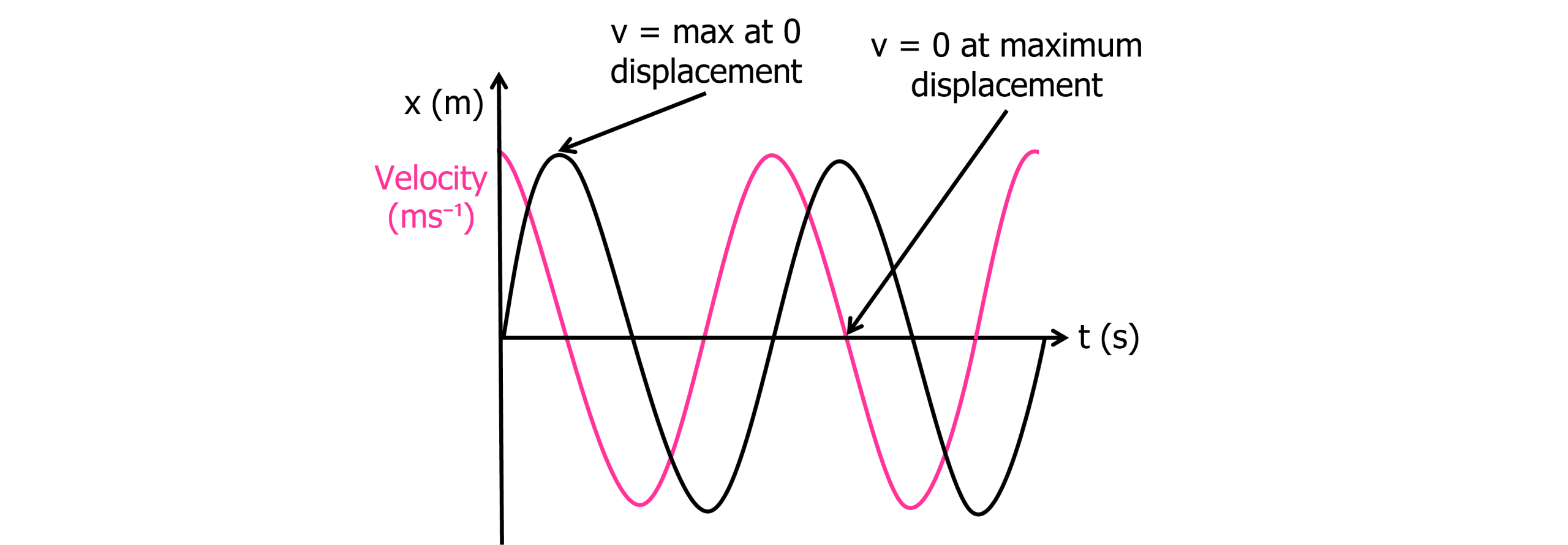 The x-t graph above is a simple sinusoidal graph. The amplitude (maximum displacement) always stays the same as there is no energy lost or gained during oscillations. Calculating the gradient at any point of the displacement-time graph gives the velocity.