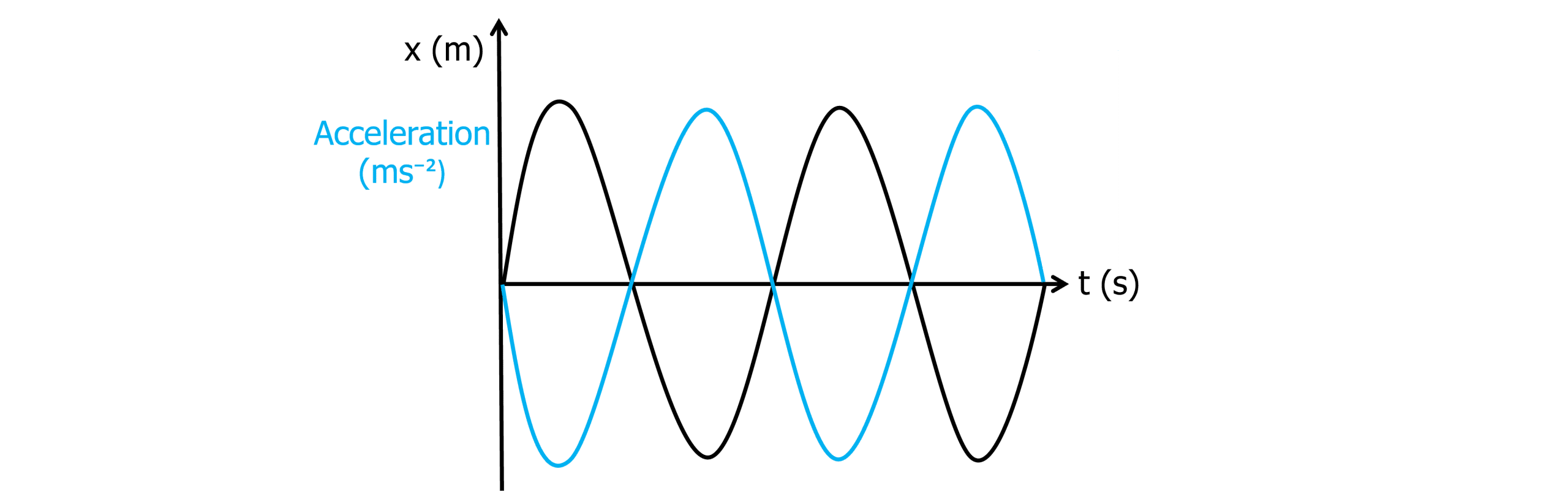The v-t graph above is a simple cosine graph. When displacement is zero from the previous graph, the velocity is maximum. When the oscillator is at its maximum displacement, the velocity is zero. Again, as no energy is gained or lost, the maximum velocity with each oscillation remains the same. Calculating the gradient at any point on the velocity-time graph gives acceleration.