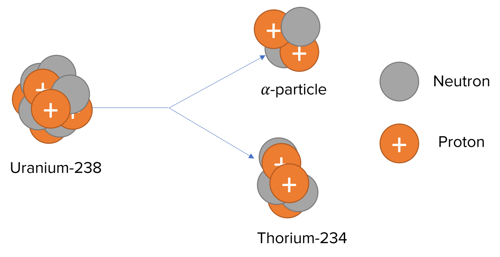 As an example, Uranium-238 undergoes alpha decay to produce Thorium-234 and an alpha particle:
