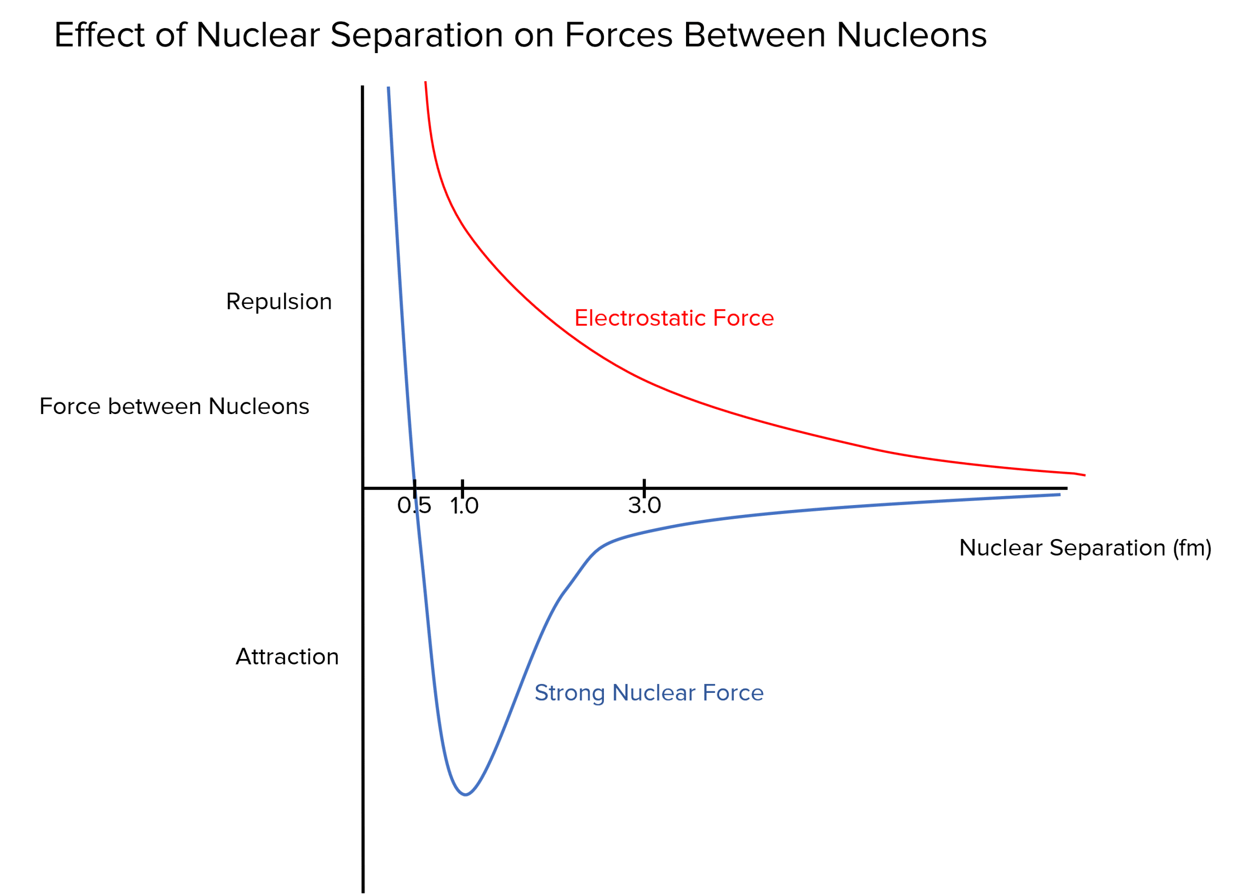 The strong nuclear force varies depending on distance \left(1 \: \text{fm} = 1×10^{-15} \: \text{m}\right):