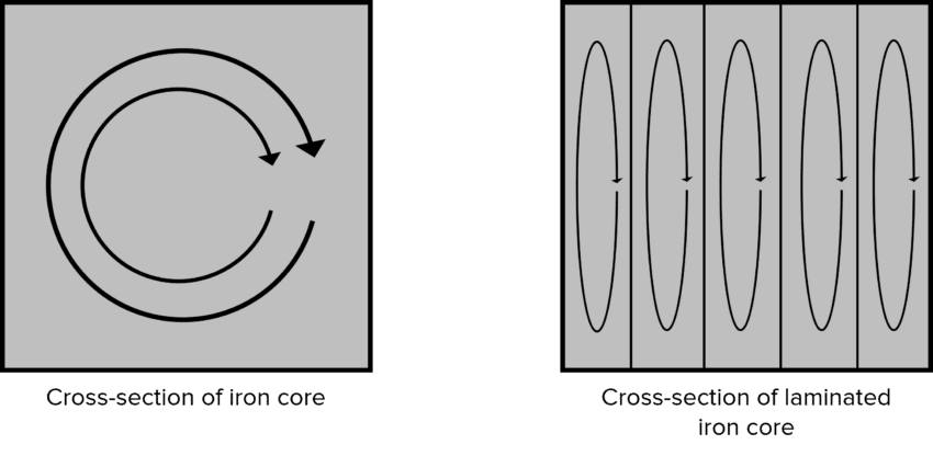 The Eddy currents can be reduced by laminating the iron core. This is where the iron core is sliced into smaller pieces with insulating materials wedged between the slices of iron. The higher the resistivity of metal also reduces eddy currents.
