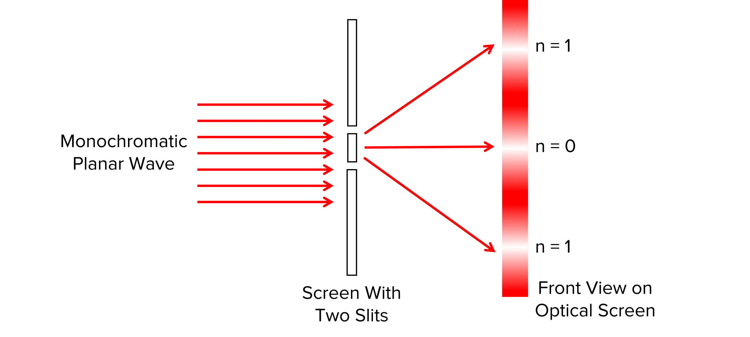 In Young’s experiment, he passed monochromatic light through two narrow slits. The light is diffracted producing a pattern as shown on the screen in the diagram above. This experiment shows light acting as a wave as this pattern is only produced when waves constructively and destructively interfere. The pattern shows a series of bright fringes (maxima) where light waves have constructively interfered, and areas of no light (minima) between the bright fringes where light waves have destructively interfered, a pattern that would not be seen if we model light as a particle.