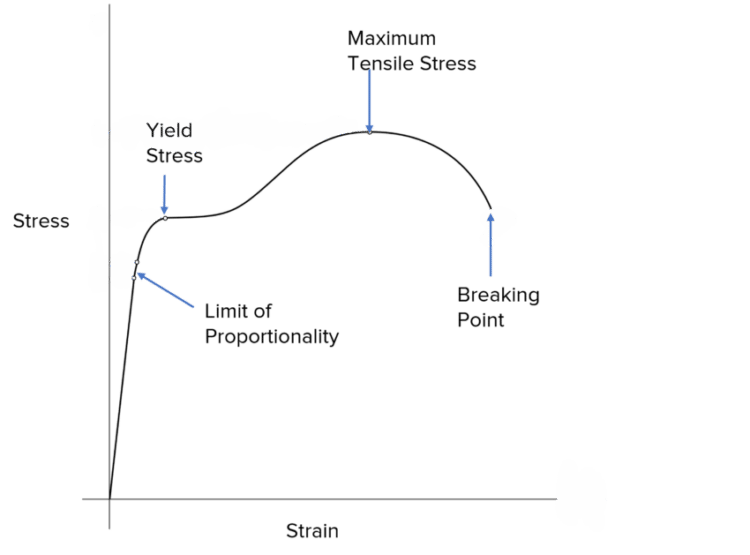 Breaking point – the endpoint of the curve. At this point the material has snapped and therefore has no stress being applied.