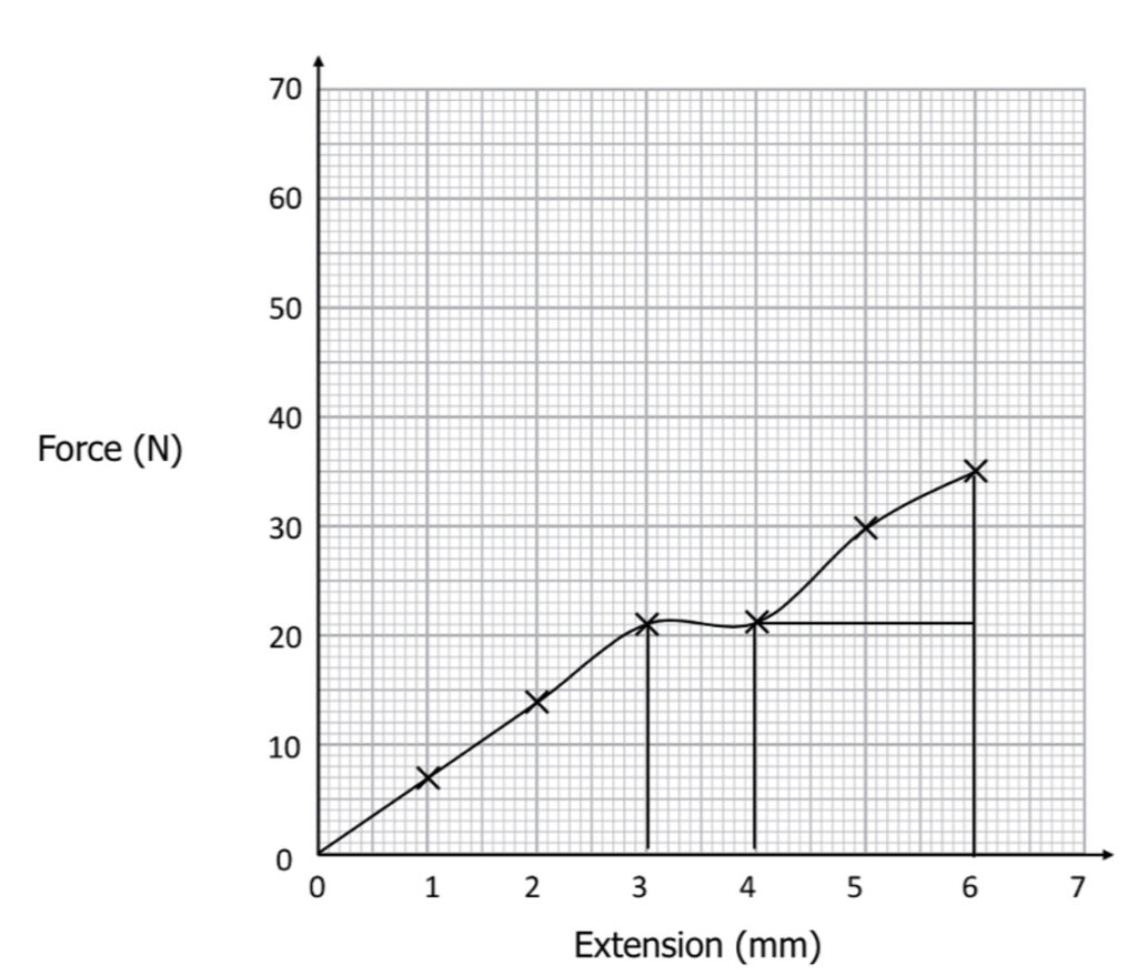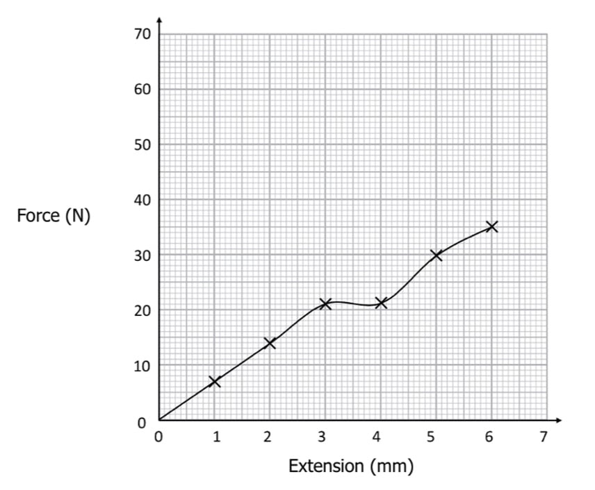 The linear section is approximately from 0 \: \text{mm} to 2 \: \text{mm} of extension. So this part of the graph obeys Hooke’s Law.