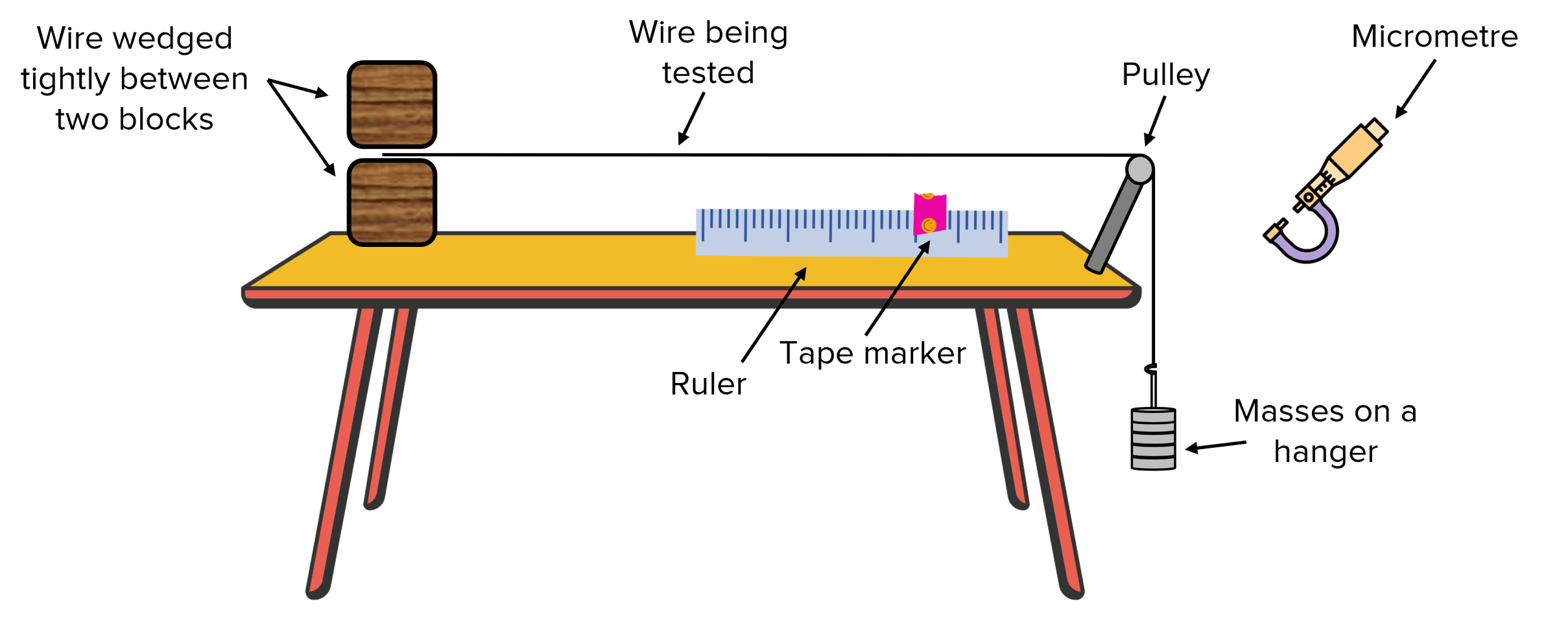 1. Firstly, before any equipment is set up, the diameter of the wire needs to be measured. A micrometer can be used for this. Measure the diameter of the wire in three different places and orientations along the wire before taking an average. Be careful not to squash the wire by over tightening the micrometer.