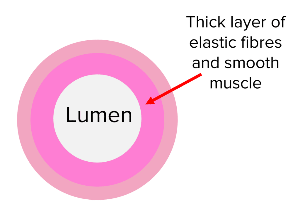 The blood is pumped out of the heart at high pressures in order to transport the blood all around the body. Arteries are adapted to be able to withstand this pressure and maintain it when the heart is relaxed. They have thick walls made up of elastic fibres and smooth muscle and a relatively narrow lumen.