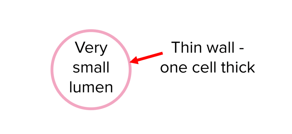Their permeable walls are only one cell thick which provides a short distance for diffusion between the blood and the cells and therefore increases the rate of diffusion.