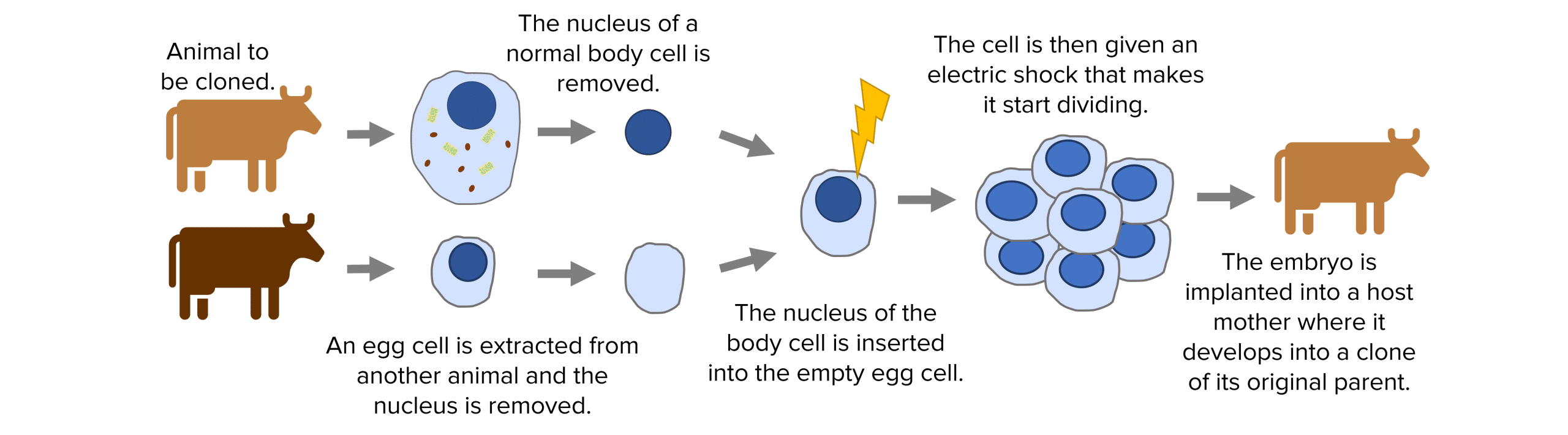 2. Adult cell cloning creates a genetically identical clone of an existing animal, the most famous example being Dolly the sheep. First, the nucleus of an unfertilised egg cell is removed. Then the nucleus of a adult body cell (from the animal you want to clone) is removed and inserted into the empty egg cell. The cell then receives an electric shock which stimulates it to divide into an embryo. The embryo is implanted into a host mother to continue its development into a clone of the original adult.