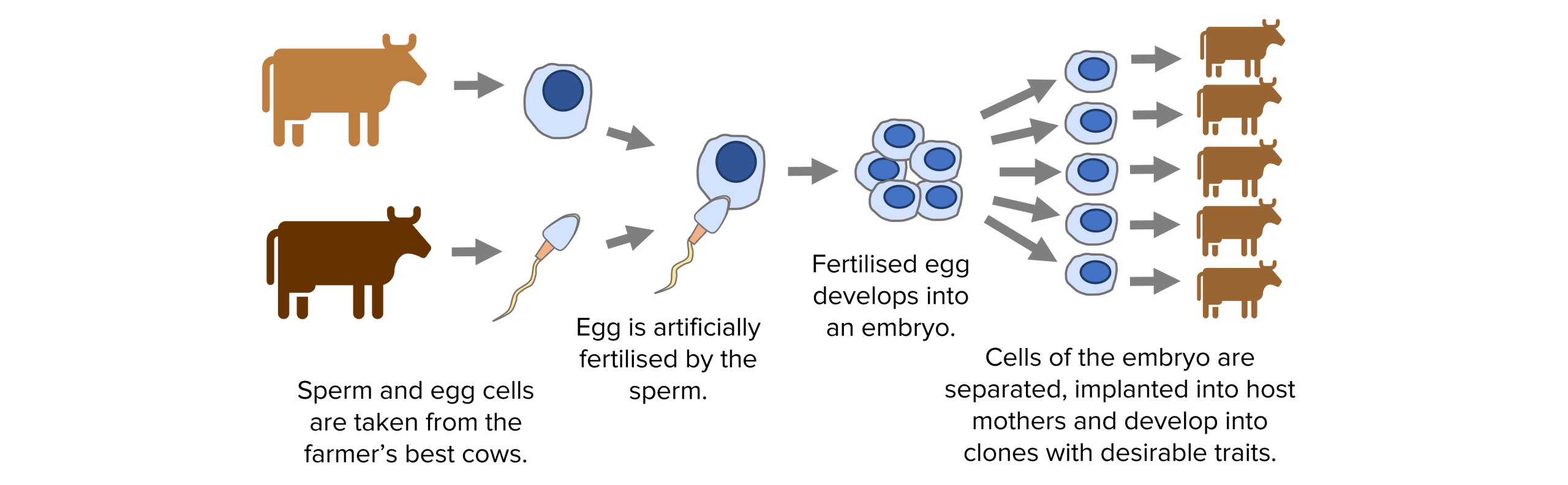 1. Embryo cloning produces cloned offspring and is often used by farmers. They will artificially fertilise an egg from their best female animal with a sperm cell from their best male animal. Before the cells start to specialise, the embryo is split into several clones. The cloned embryos continue developing and get implanted into host mothers. Lots of genetically identical animals with desired characteristics from the original parents will be formed.