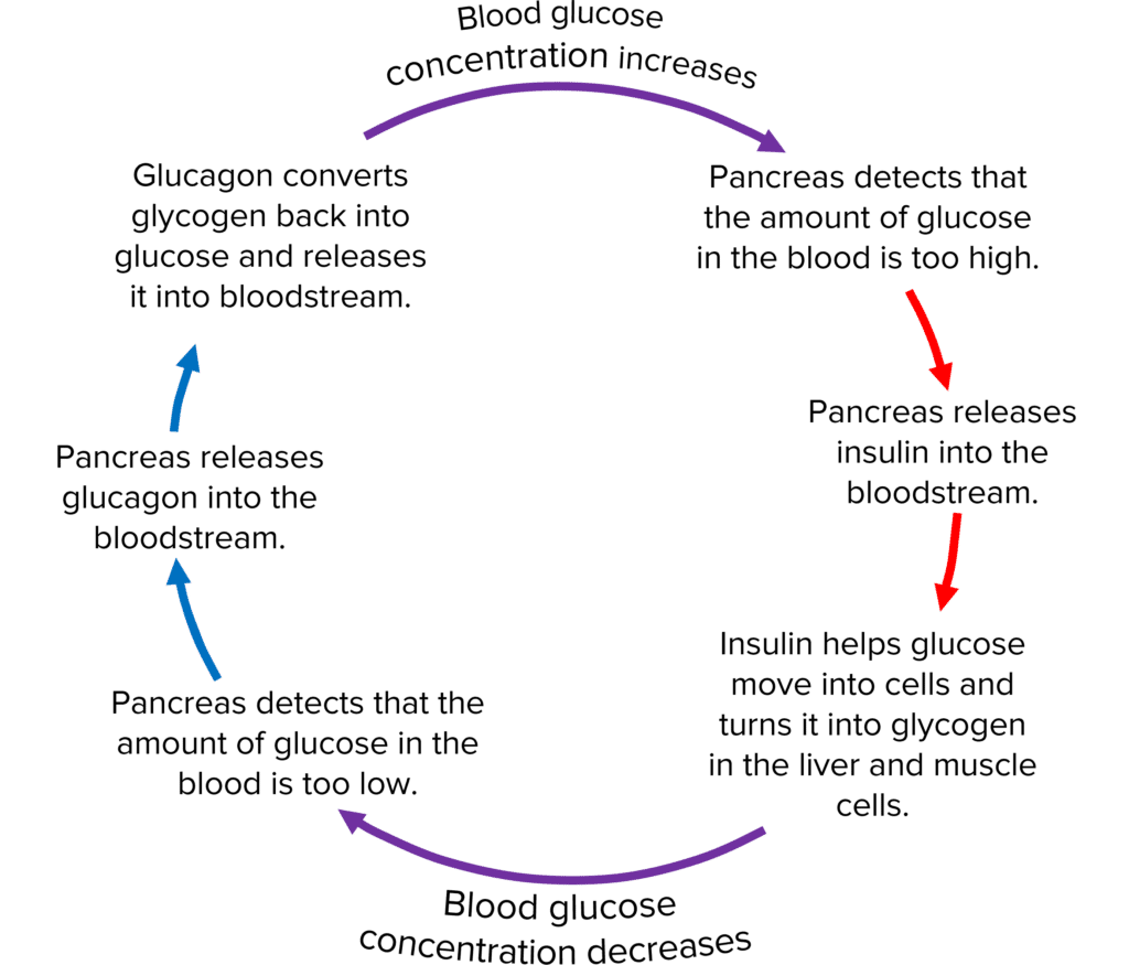 When blood glucose levels are too low, the pancreas releases the hormone glucagon. Glucagon turns glycogen in the liver back to glucose. The glucose is then released into the bloodstream and the blood glucose concentration increases again.