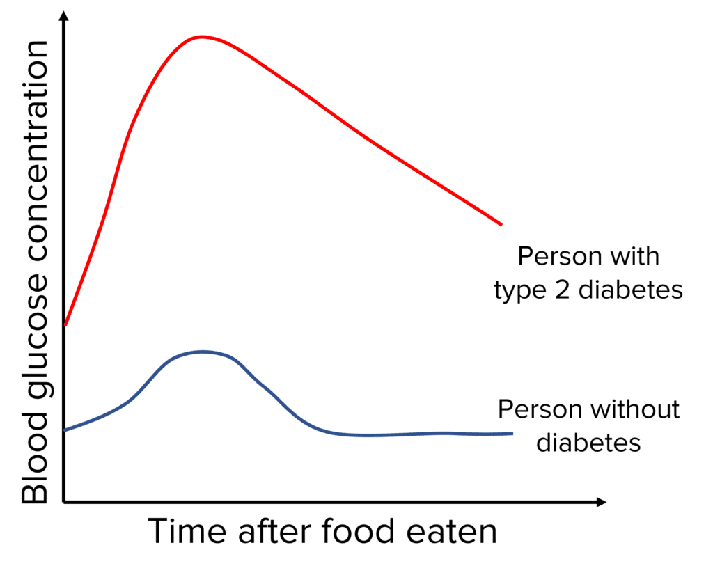 - The graph on the right shows how people with type 2 diabetes will struggle to keep their blood glucose levels down after eating the same food as a person without the disease- glucose moves into cells much slower causing a build up in the bloodstream.