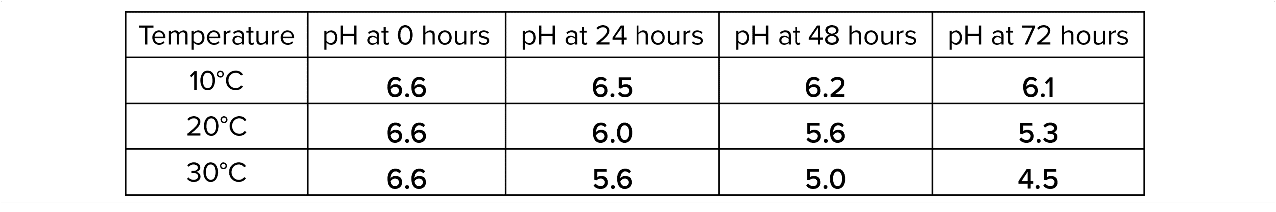 - Use universal indicator solution/paper or a pH probe to check the pH of each beaker after 24\text{, } 48 \text{ and } 72 \text{ hours}. The pH should decrease over time.
