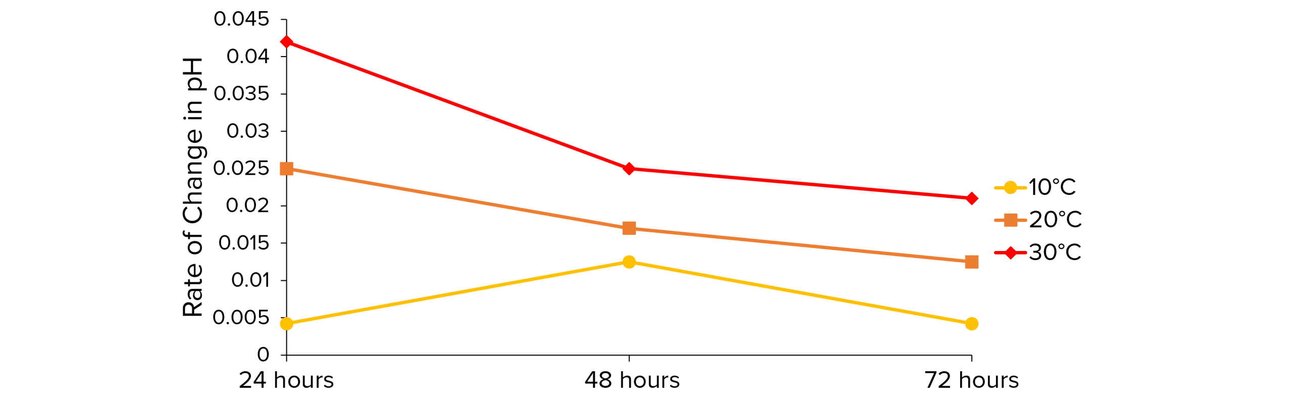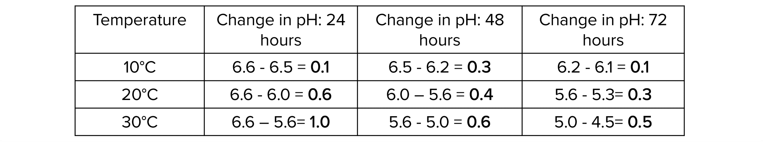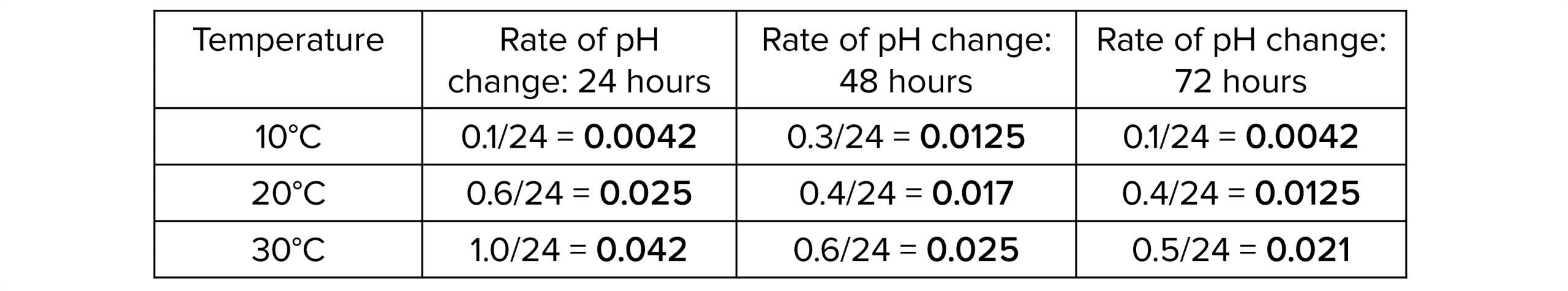 1. Calculate how much the pH has changed every 24 hours (at each temperature) by subtracting the current pH from the pH reading taken 24 hours before.