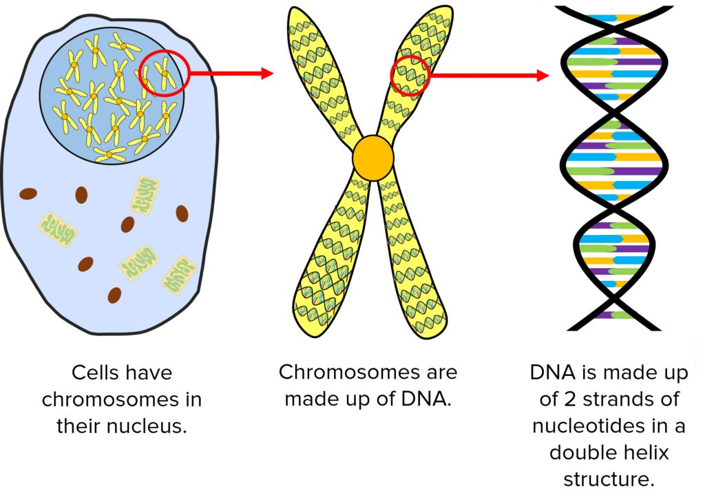 DNA is a chemical found in the nucleus of cells that holds all the genetic information for an organism. DNA is made up of a chain of nucleotides that form chromosomes. Each chromosome contains several genes that contain the information to create specific proteins via protein synthesis. All of the genes of an organism is called a genome and understanding the human genome has lead to several scientific and medical breakthroughs. Changes to the genetic information are called mutations and can sometimes be harmful.