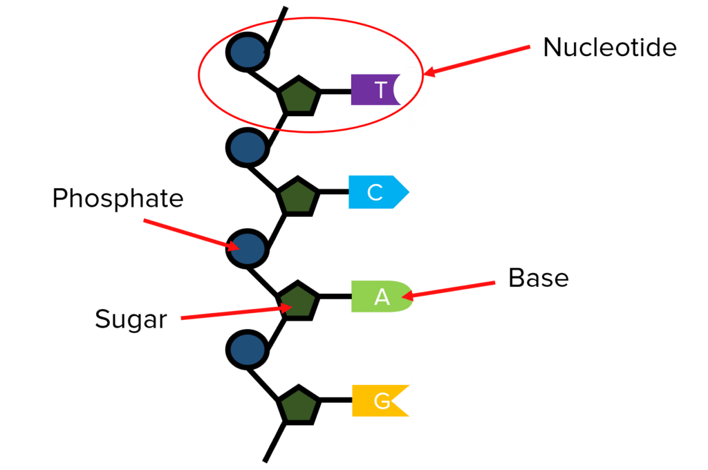 All the nucleotides contain a sugar and a phosphate group but will have one of 4 different bases, A, T, G and C.