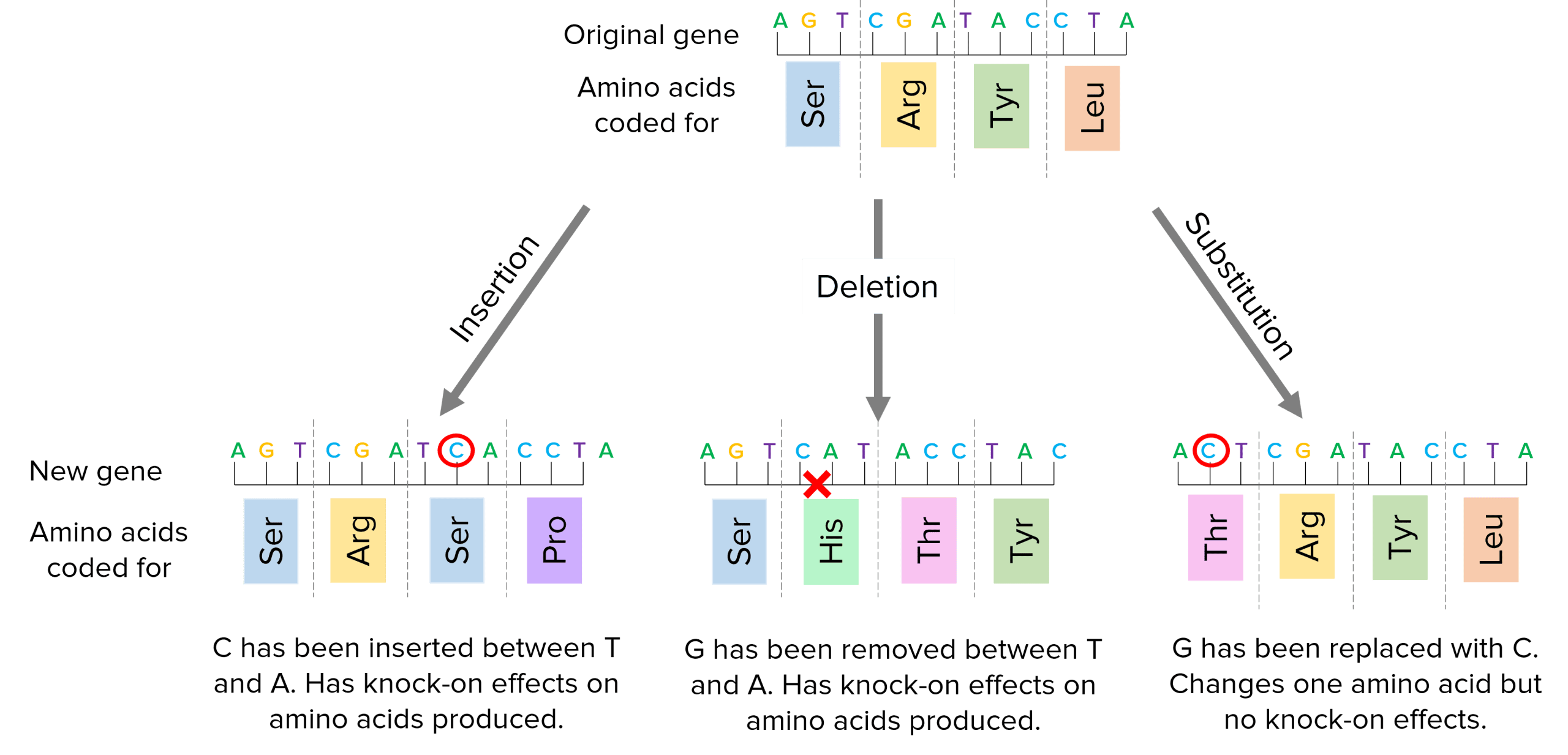 - Deletions– A base is removed from the sequence which will have knock-on effects further down the sequence and cause major changes to the amino acids coded for and the protein produced.