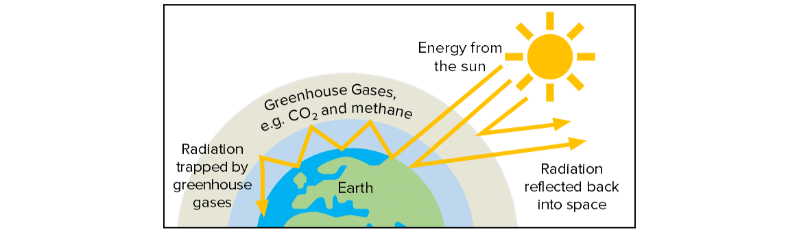 Levels of greenhouse gases such as carbon dioxide and methane are rising rapidly due to human activities, e.g. burning fossil fuels, deforestation, increased cattle rearing. This means more of the Sun’s energy is getting trapped within the Earth’s atmosphere and the earth is getting increasingly warmer. This is called global warming.