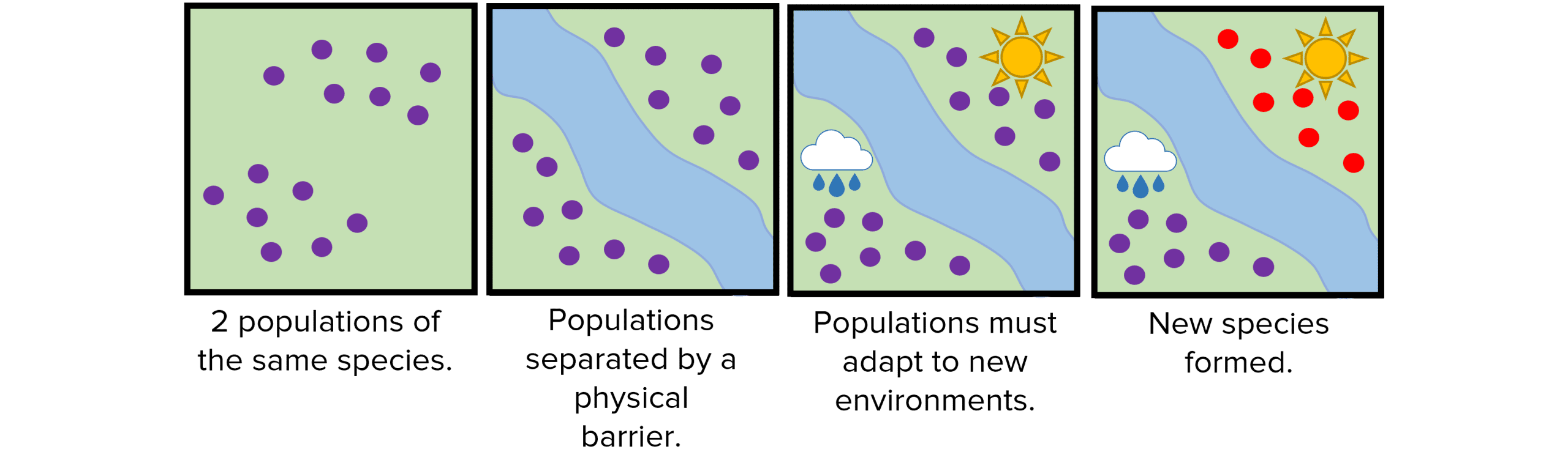 - Populations of species are separated due to a physical barrier such as a river or mountain range.