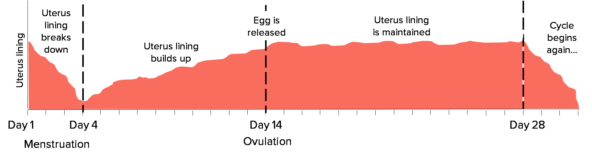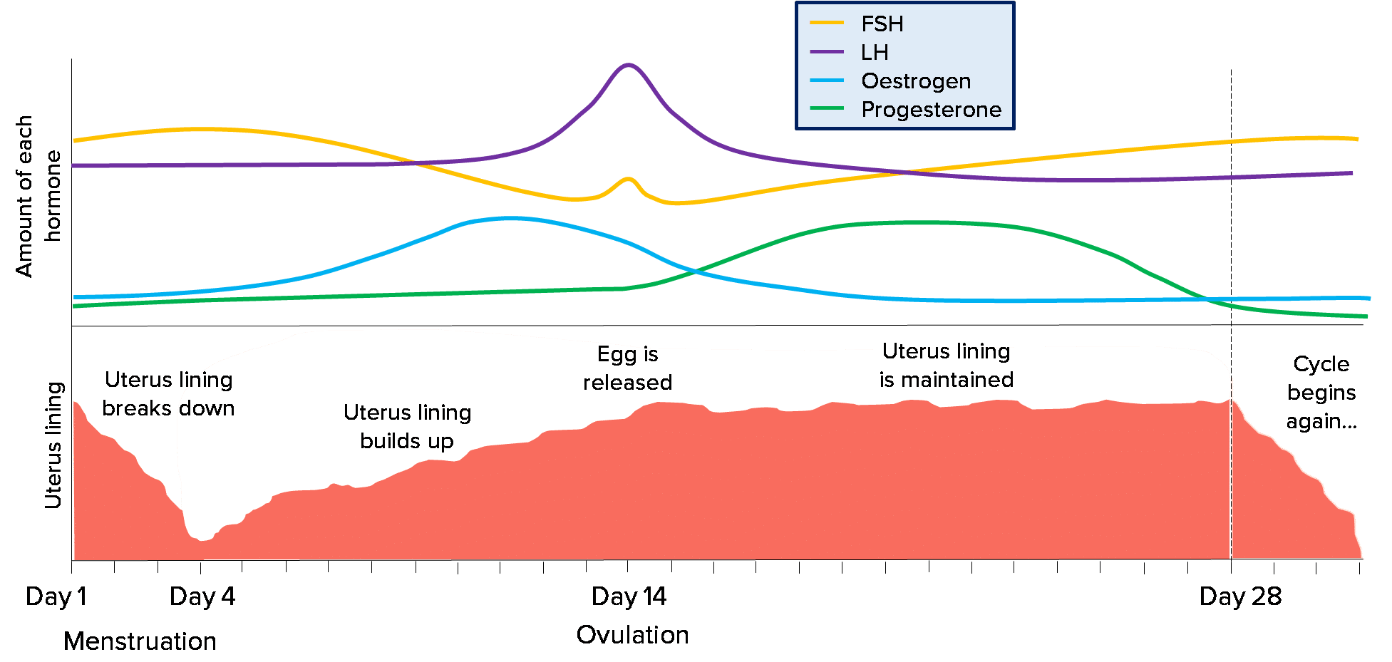 The menstrual cycle is the system where the female body prepares for potential pregnancy by building up the lining of the uterus and developing and releasing an egg cell from the ovaries. If no fertilised egg lands on the uterus wall after 28 days, the lining breaks down again and the cycle repeats.