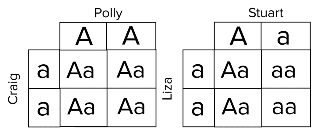 We know that Polly is homozygous dominant so her genotype will be AA. Craig must be homozygous recessive (aa) as he is unaffected.