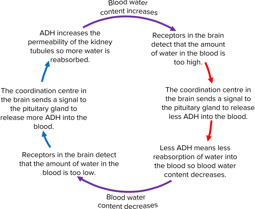 - The coordination centre sends signals to the pituitary gland to release more ADH if blood water content is too low or less ADH if blood water content is too high.