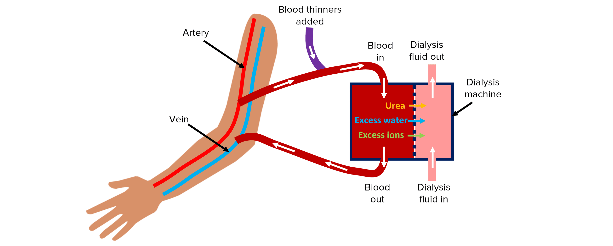 The patient’s blood flows from an artery in the arm into a dialysis machine, where waste products get filtered out and the balance of ions and water is restored, before being returned to the body via a vein in the arm.
